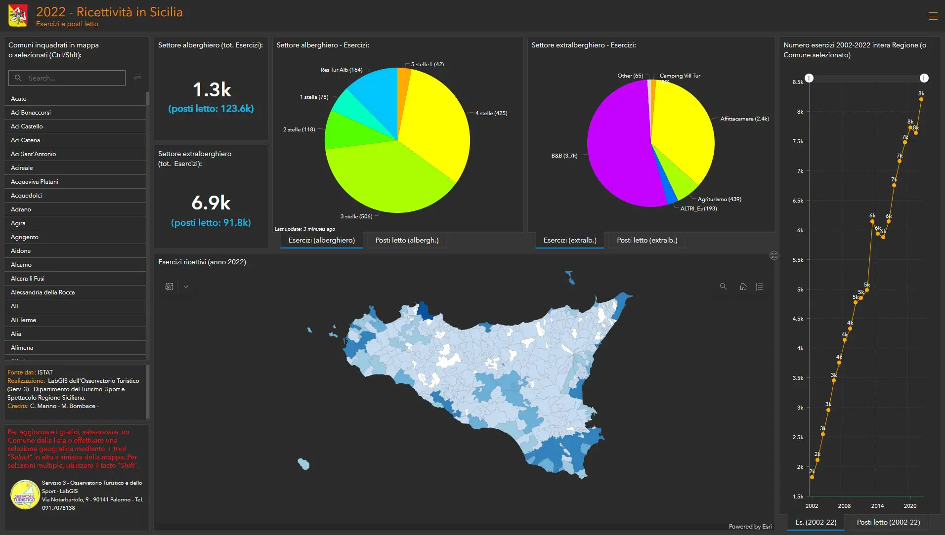 Attraverso la consultazione della dashboard qui presentata non sfuggirà, al lettore più attento, la possibilità di approfondire le informazioni sin qui sinteticamente descritte, con la consultazione della serie storica, con dettaglio comunale, dei dati sulla capacità ricettiva (n. esercizi e posti letto) della Sicilia dal 2015 al 2022 così come la mappa interattiva della sua distribuzione geografica sul territorio ed eseguire interrogazioni specifiche e di dettaglio spazio-temporale sulle variabili rappresentate.